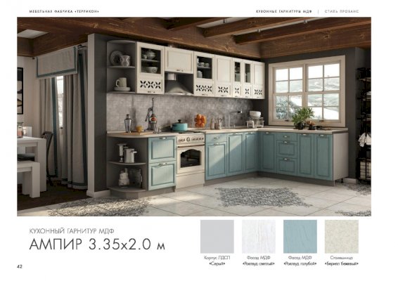 Кухня Ампир изговаливается также в цветах серый/роялвуд сирень; серый/роялвуд бирюза; серый/роялвуд голубой. Модули в этих цветовых решениях вы сможете найти в нашем интернет-магазине.