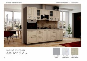 Хотите готовить и проводить время на кухне с удовольствием? Укомплектуйте помещение красивой и удобной мебелью — закажите гарнитур «Ампир»! Комплект эстетичен и функционален. В него входят все необходимые для создания идеальных условий элементы. Холодные оттенки поддерживают праздничное, романтическое настроение. Немного гламура в обстановку вносят прорезные орнаменты на дверцах подвесных шкафчиков.