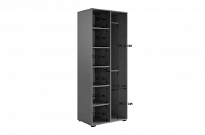 Шкаф оснащён длинными пластиковыми ручками и имеет удобное внутреннее наполнение: слева расположены полки, а справа — две штанги для вешалок. Это позволяет рационально использовать пространство и разместить различные типы одежды.