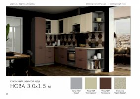 Кухонный гарнитур «Нова» доказывает, что простые вещи могут выглядеть дорого и эксклюзивно. Эффект элитарности достигается благодаря высокому качеству используемых материалов. Глянцевые поверхности смотрятся роскошно. Элегантная фурнитура и стеклянные дверцы подвесных шкафов делают комплект менее тяжеловесным и более утонченным.