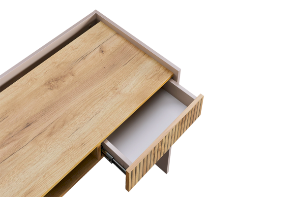 Корпус стола выполнен в цвете кашемир, что придает ему современный и спокойный вид, легко сочетающийся с любым интерьером. Выкатной ящик в цвете "дуб крафт золотой", декорирован принтом, имитирующим вертикальную фрезеровку, что добавляет столу уникальности и роскоши.