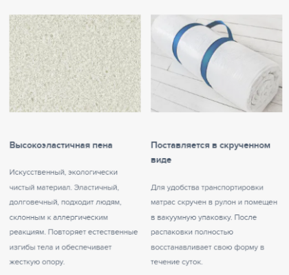 Матрас Flex Big изготовлен на основе монолитного блока из гипоаллергенного, влагоустойчивого и долговечного материала Foam благодаря высокой степени упругости обеспечивает идеальный анатомический эффект. Чехол изготавливается из хлопкового жаккарда, простеганного на синтепоне. Благодаря составу чехол хорошо пропускает воздух и сохраняет тепло. Для удобства транспортировки толстый матрас Flex Big скручен в рулон и помещен в вакуумную упаковку. После распаковки полностью восстанавливает свою форму в течение суток.