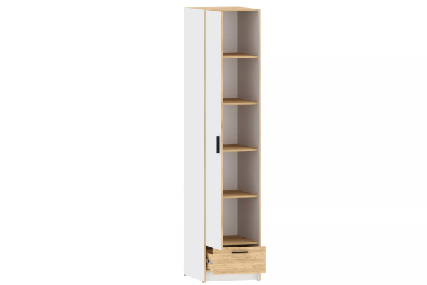 Шкаф оснащен пятью полками для хранения вещей, а также выдвижным ящиком с шариковыми направляющими, за счет которых ящик выдвигается плавно и бесшумно. Шкаф является модульным, что позволяет комбинировать его с другими шкафами из одноименной коллекции. Лаконичный дизайн шкафа гармонично подчеркивается черными ручками. Сборка шкафа универсальна – дверь может крепиться как на правую, так и на левую стороны.