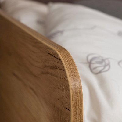 Кровать выполнена как подростковая кровать-тахта с большим выкатным ящиком на роликах. Изголовье и изножье со скругленными углами облицованы ударопрочной кромкой ПВХ 2 мм, что, безусловно, немаловажно для детей и родителей, выбирающих мебель. Обратите внимание, что изножье совсем не высокое и не будет мешать садиться на кровать даже с этой стороны, поэтому кровать можно ставить не только у стены.