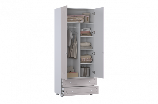 Слева внутри шкафа расположена штанга для плечиков, предназначенная для хранения одежды на вешалках. Правая часть оборудована полками, которые подойдут для аккуратного размещения сложенной одежды, коробок или аксессуаров. В нижней части предусмотрены два вместительных выкатных ящика для хранения, обеспечивающих дополнительное место для вещей повседневного использования.